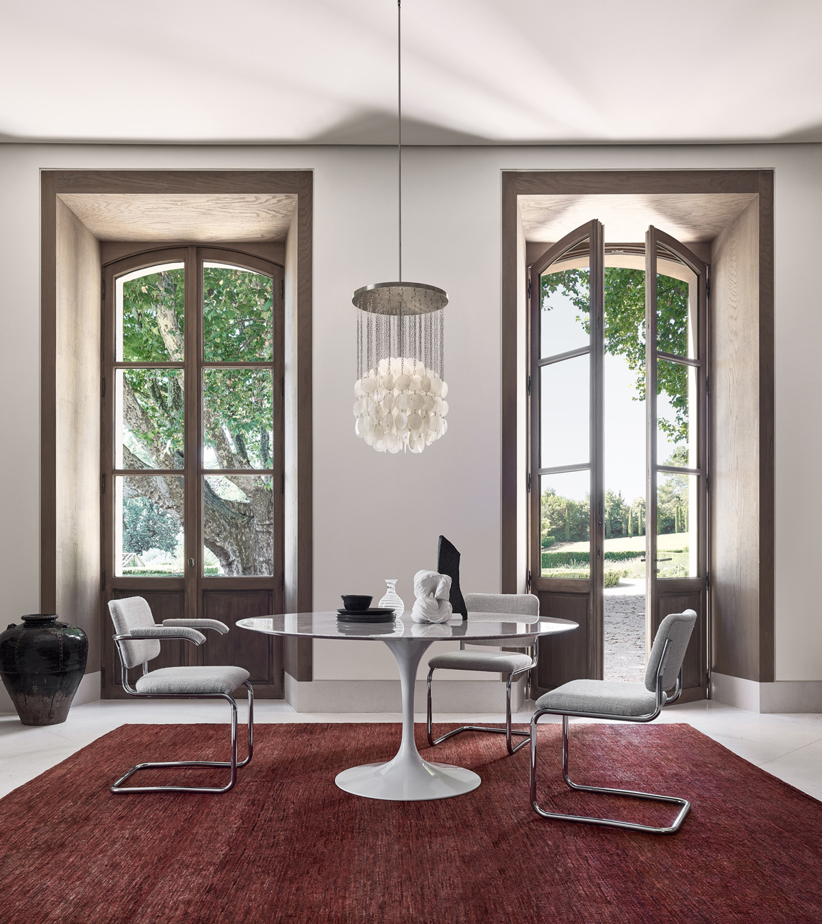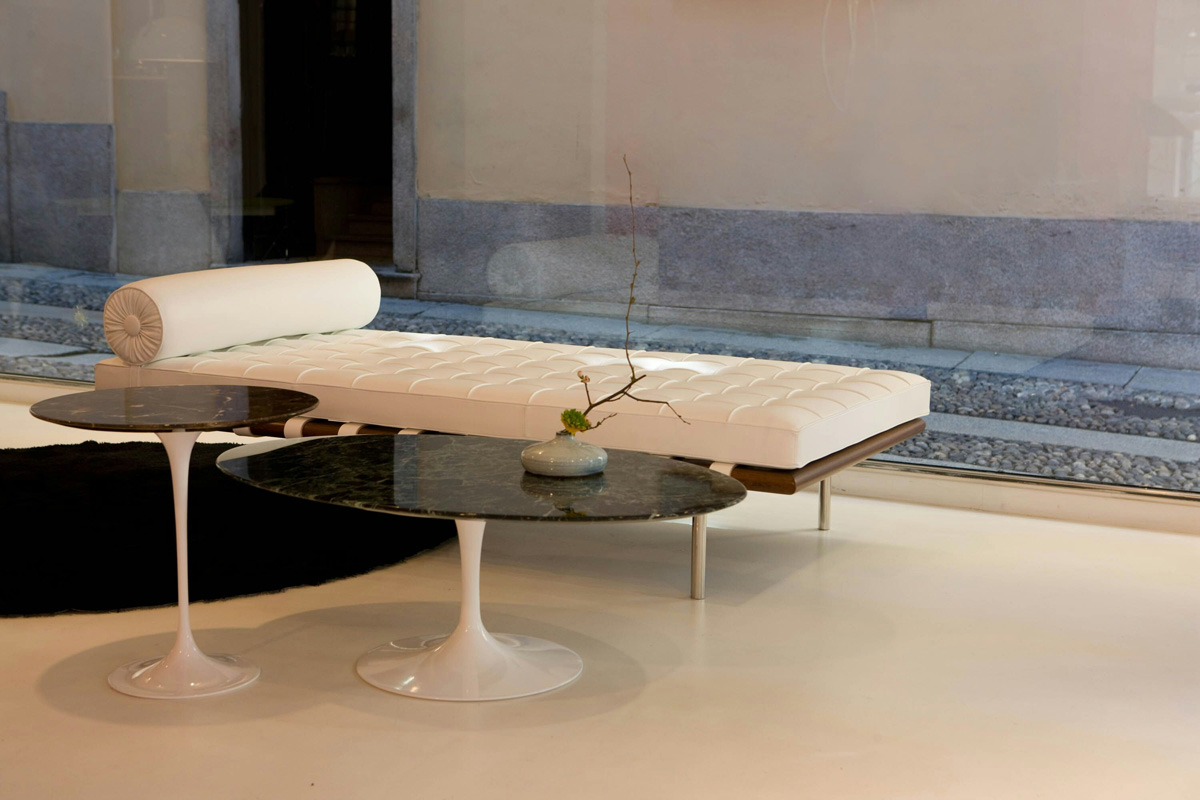 Eero Saarinen designed his now famous Saarinen Table for Knoll with the intention of finding an alternative to the “slum of legs” he observed beneath chairs and tables. After years of iterating on his designs, he came up with an elegant pedestal base. One of the most recognizable tables of the modern era, the Saarinen Coffee Table features a beveled tabletop and gracefully shaped cast-aluminum base inspired by a drop of high-viscosity liquid. Sleek and stylish, it will enhance any lounge setting or executive suite.