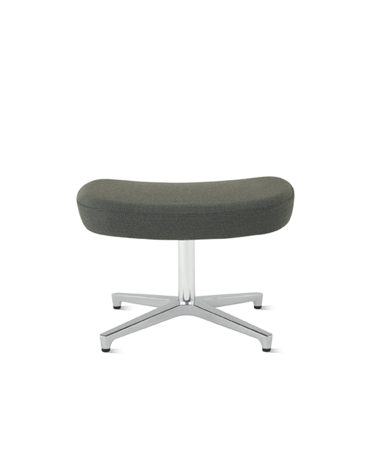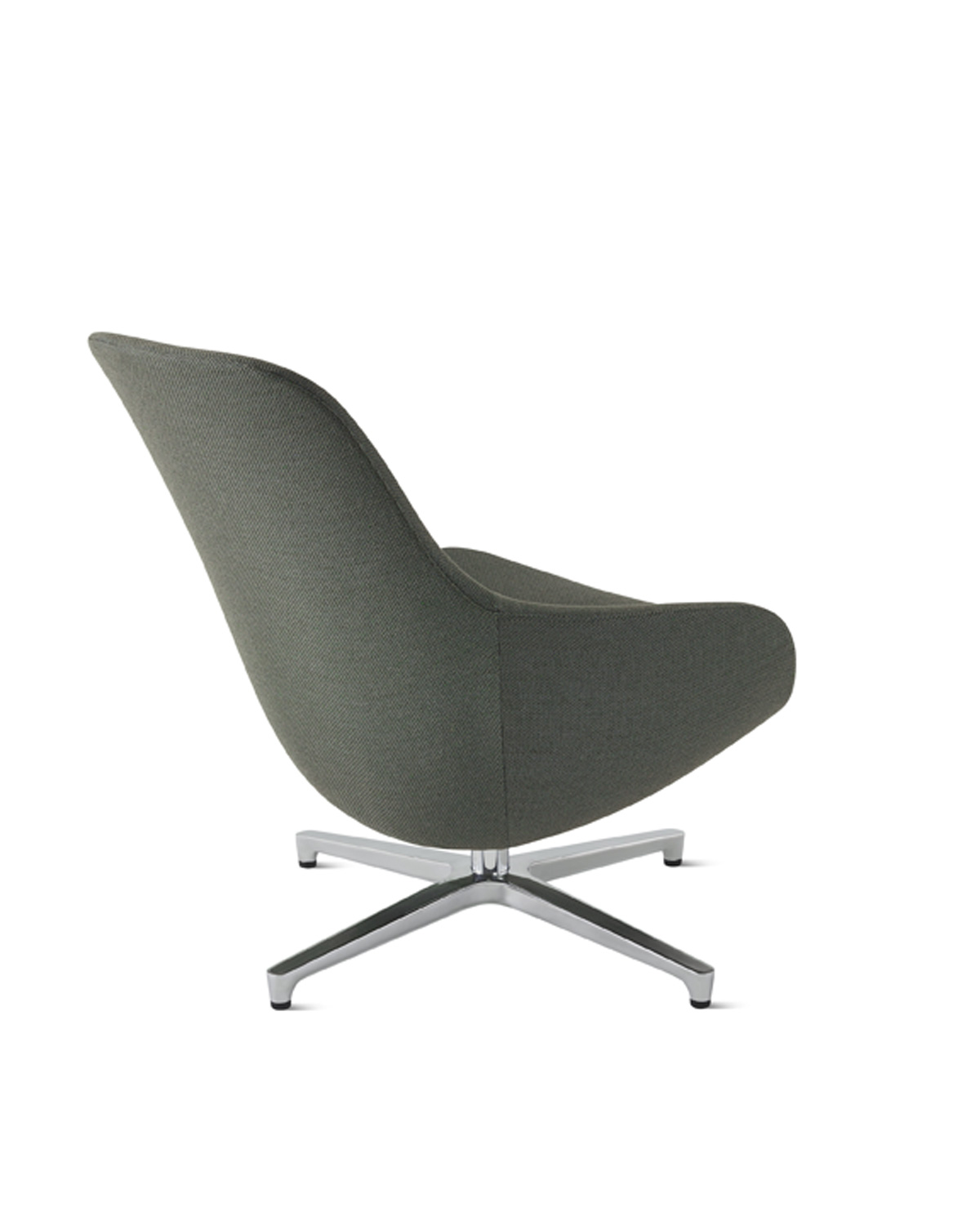 The sleek, contoured high-back Saiba Lounge Chair—impeccably tailored in a curated textile offering and set atop a black or polished aluminum base—invites people to settle in and relax, especially when paired with the low set, cushioned Saiba Ottoman.