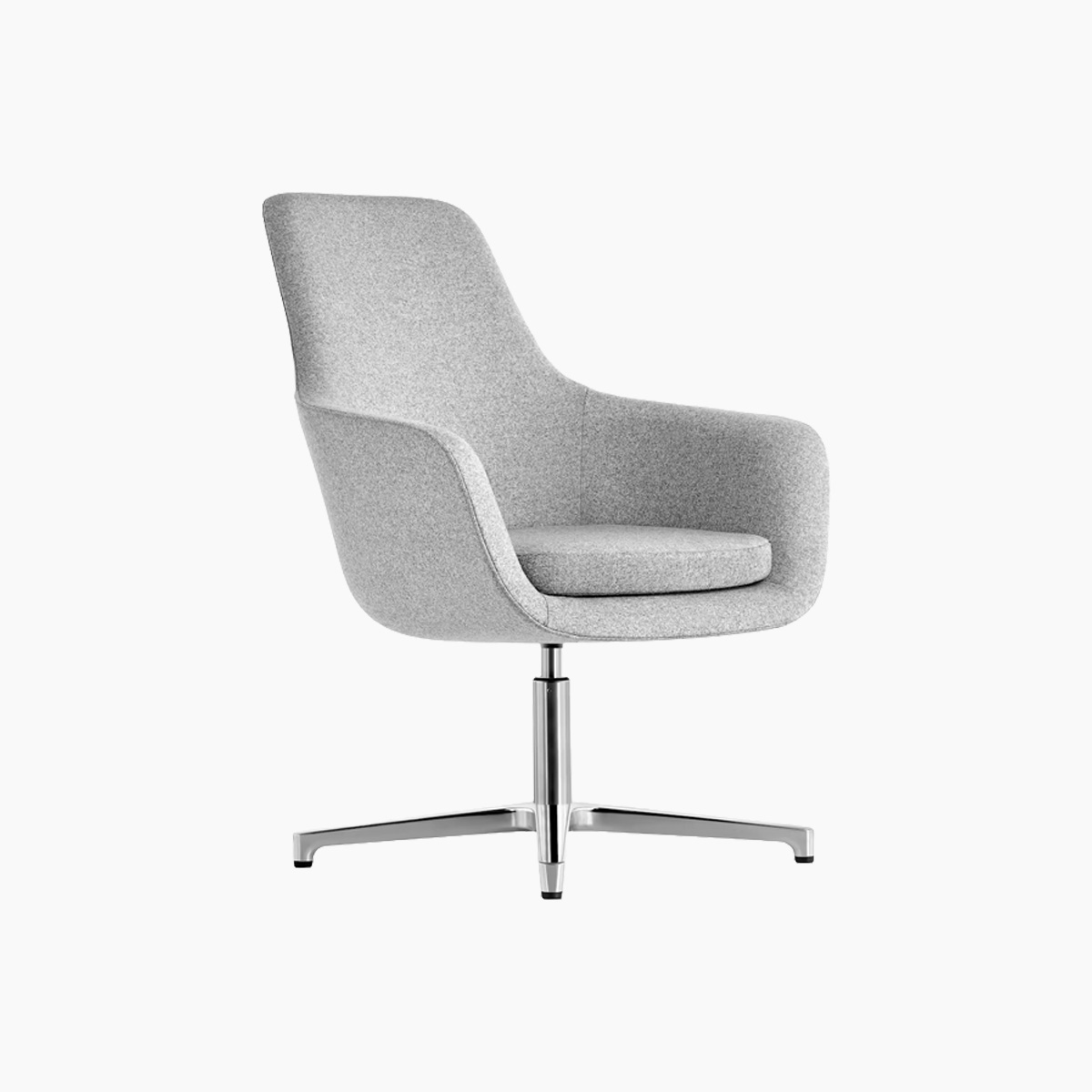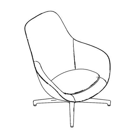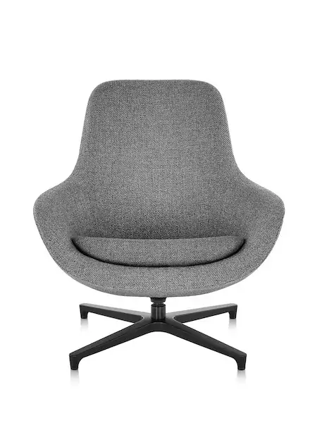 The sleek, contoured high-back Saiba Lounge Chair—impeccably tailored in a curated textile offering and set atop a black or polished aluminum base—invites people to settle in and relax, especially when paired with the low set, cushioned Saiba Ottoman.