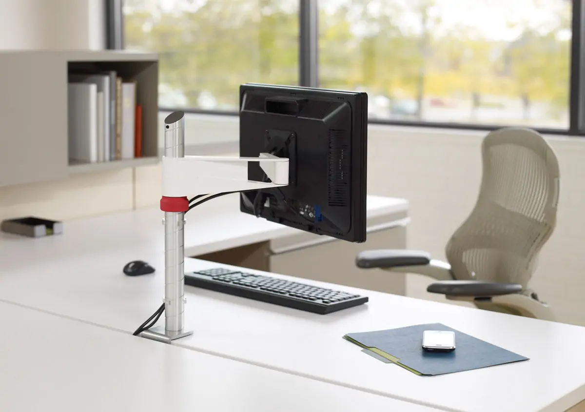 The Sapper Single Monitor Arm from Knoll is a simple, graceful solution for mounting a monitor. Its design offers 360-degrees of rotation from portrait to landscape, 180-degree swivel from left to right, and 165-degrees of up and down tilt. Available in a variety of mounting options, it holds up to 20 pounds/nine kilograms and includes cable management to keep wires organized.