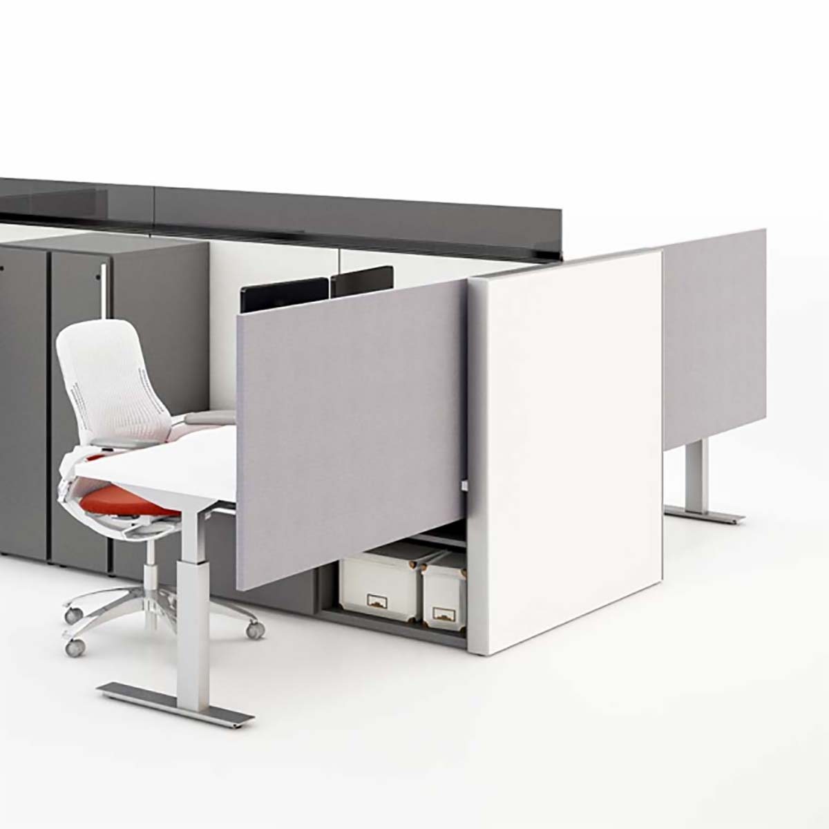 Series 2 Universal Privacy Screens provide space division for focused work while aiding with noise reduction. Series 2 Screens also feature integrated Slatwall that enables users to free up space at the desk by attaching accessory and storage solutions directly to the screen. Easily retrofittable, Series 2 Universal Privacy Screens extend below the worksurface providing a built-in modesty panel.