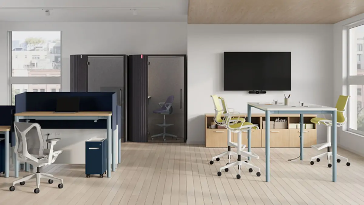Bring ergonomic versatility to any space with the Spout Sit-to-Stand Table from Herman Miller. Available in a range of sizes and configurations, it’s ideal for bringing a more active work style to private offices or quick touch-down spaces for workers on the go. Uniquely designed with four legs for a more traditional silhouette, Spout includes discreet storage tucked under its tabletop and an array of accessories that further enhance its functionality like bag hooks, casters, and optional power access at the surface.