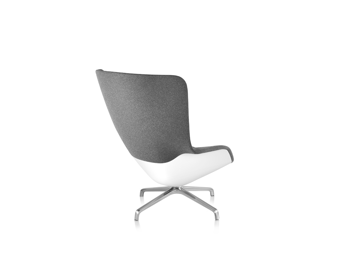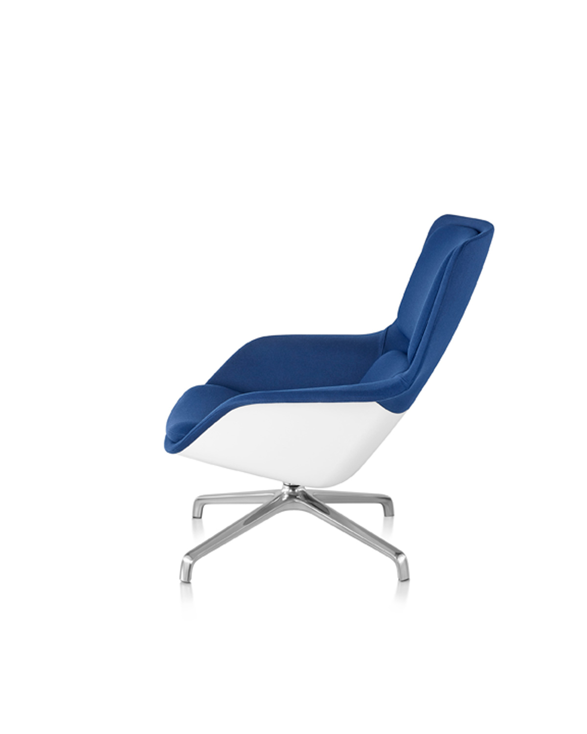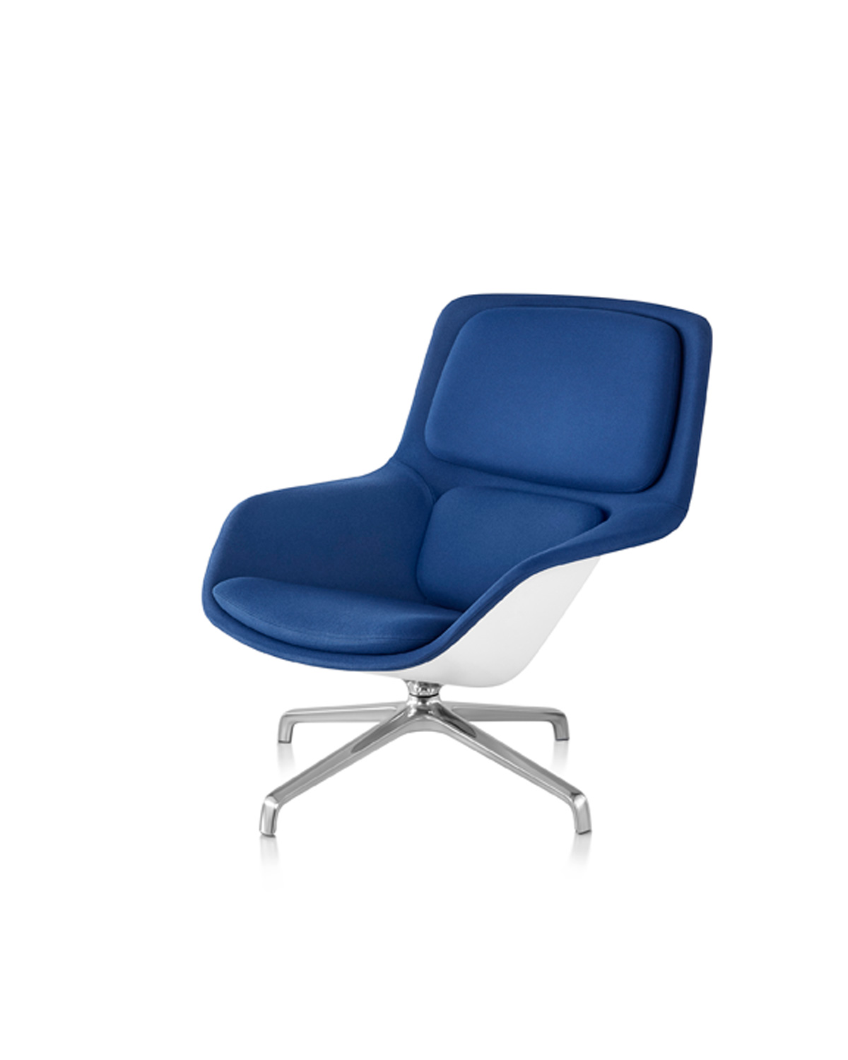 The Striad Lounge Chair for Herman Miller provides supple, pliable comfort. It comprises a rigid outer shell merged with a natural-fiber inner shell; both are fully upholstered then topped with deep-set, dual-density cushions that add supple support. Striad comes with a choice of a four-star auto-return base or fixed four-leg wire base—as well as a range of finish and fabric options.