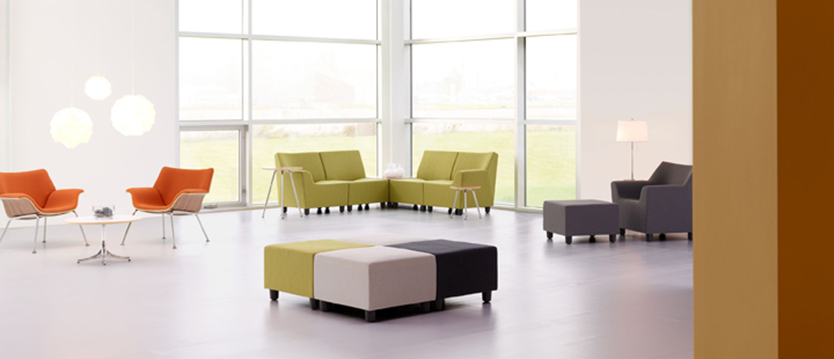 The Swoop family includes plywood lounge chairs with exposed wood shells, as well as fully upholstered club chairs and modular seating components.
