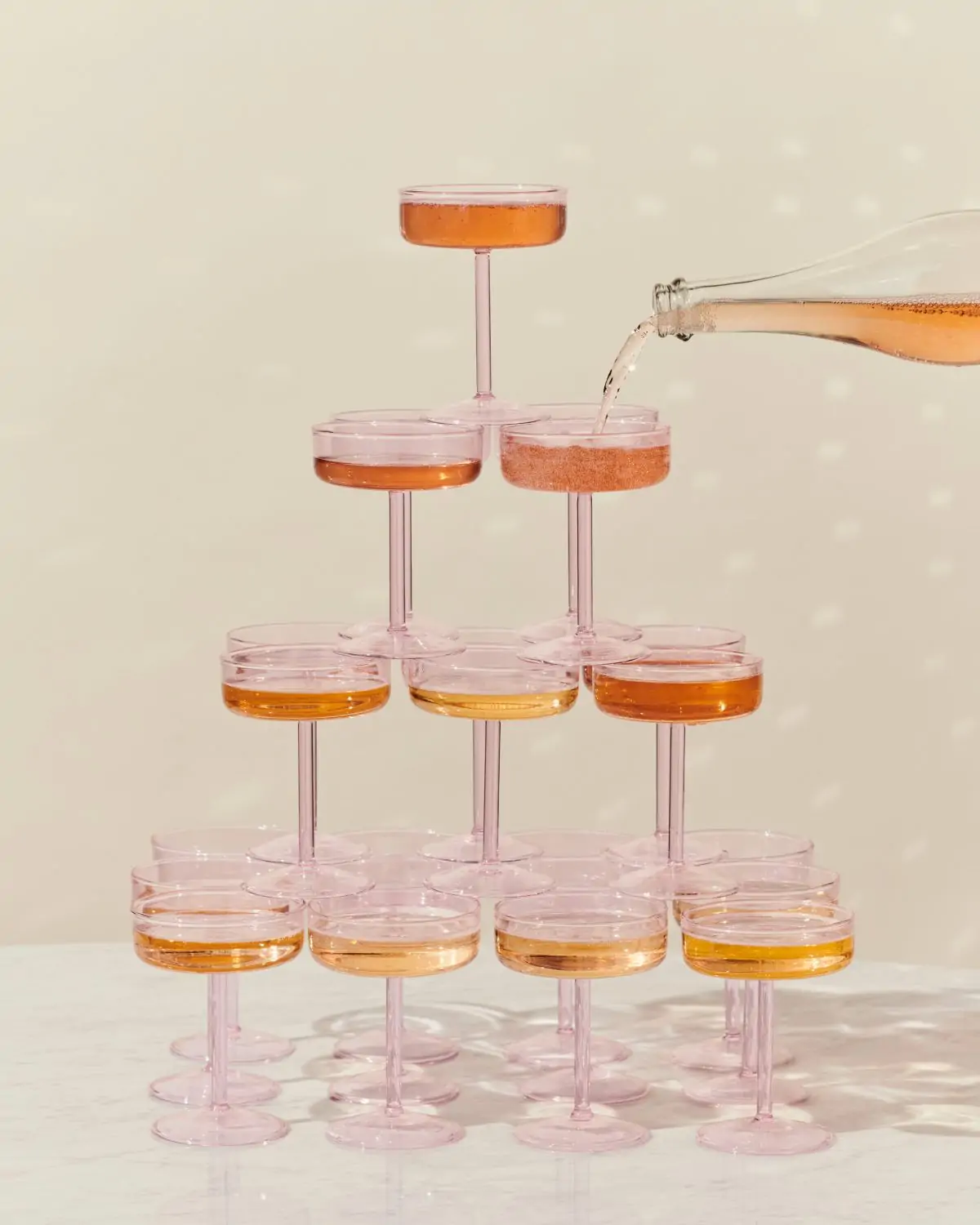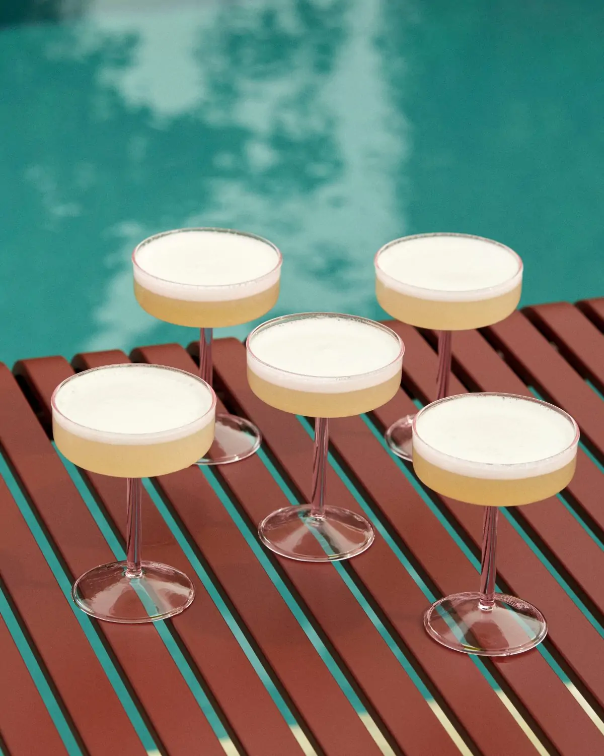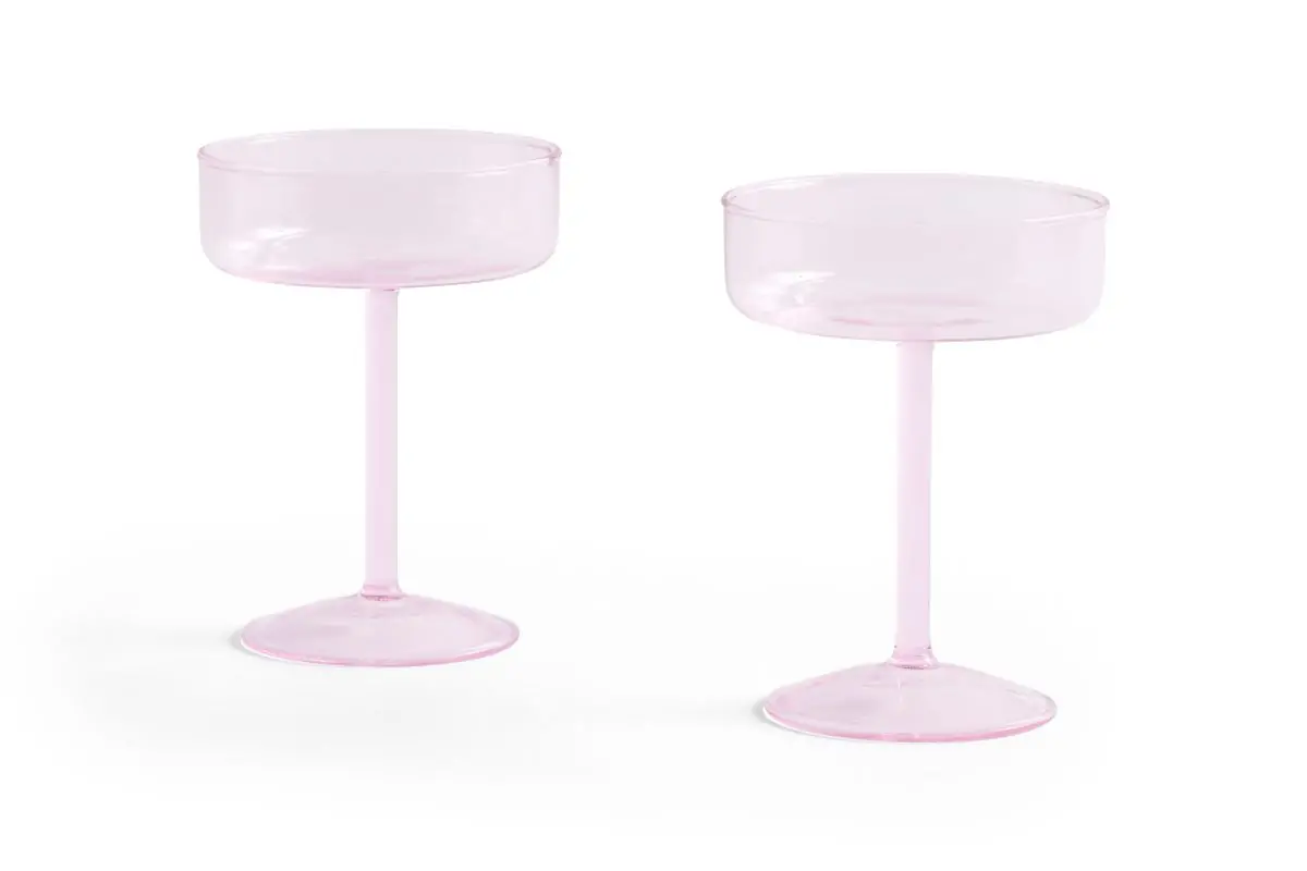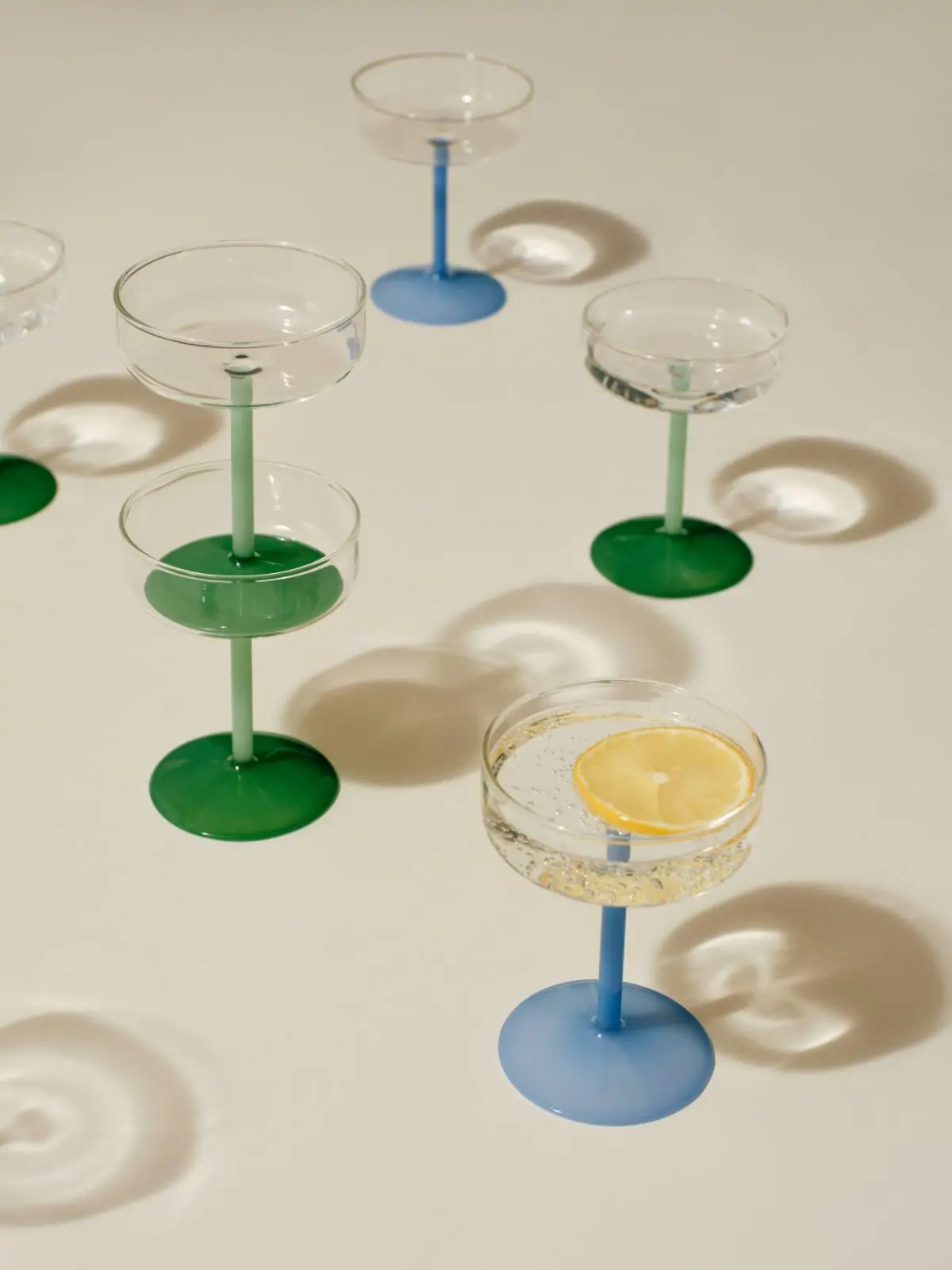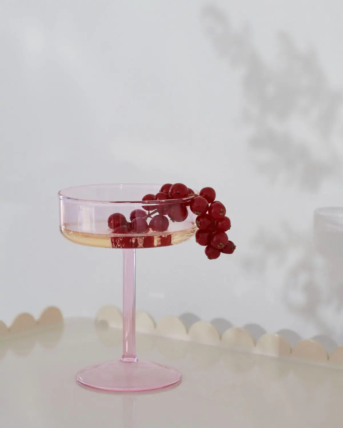 Tint Coupe Glass is a collection of elegant glasses made in tinted borosilicate glass. The classic coupe design features a long stem and shallow, broad bowl, making it suitable for serving champagne and cocktails, as well as ice cream, fruit or other desserts. The glasses come in sets of two.
