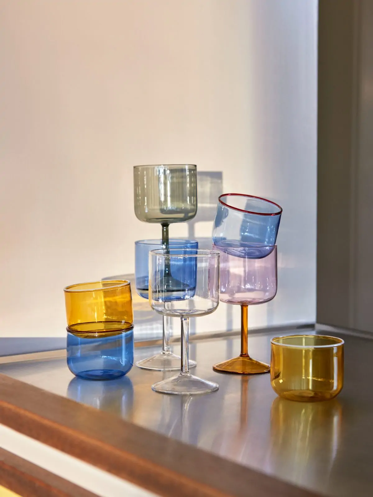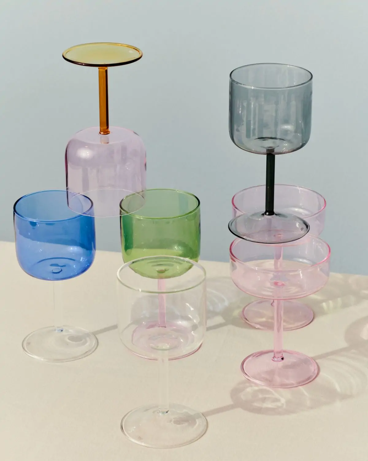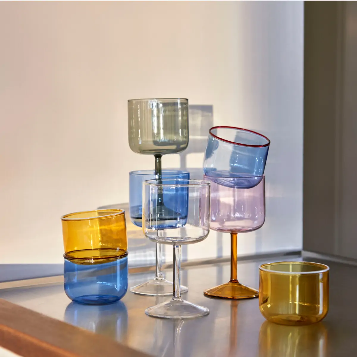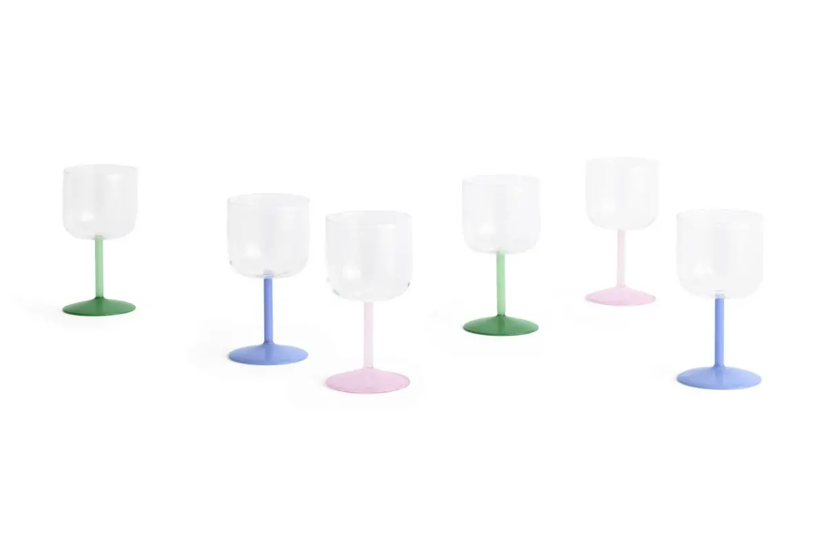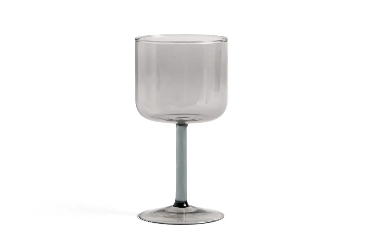 Tint Wine Glass is a collection of wine glasses made in tinted and clear borosilicate glass. The elegant, simple design is suitable for serving wine, as well as water, juice and other soft drinks. The glasses come in sets of two, available in different colours.