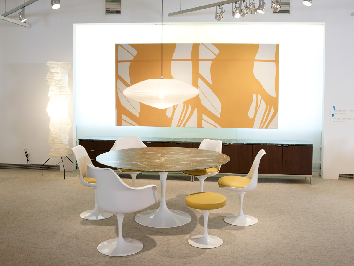 Saarinen was assisted by Don Petitt, of Knoll’s Design Development Group, who introduced several ingenious methods of model making. Together with a Knoll design research team, they worked out the problems arising in production. Full scale models became furniture and, with family and friends acting as “guinea pigs,” the furniture was tested in the dining room and living room of the Saarinen house in Bloomfield Hills.