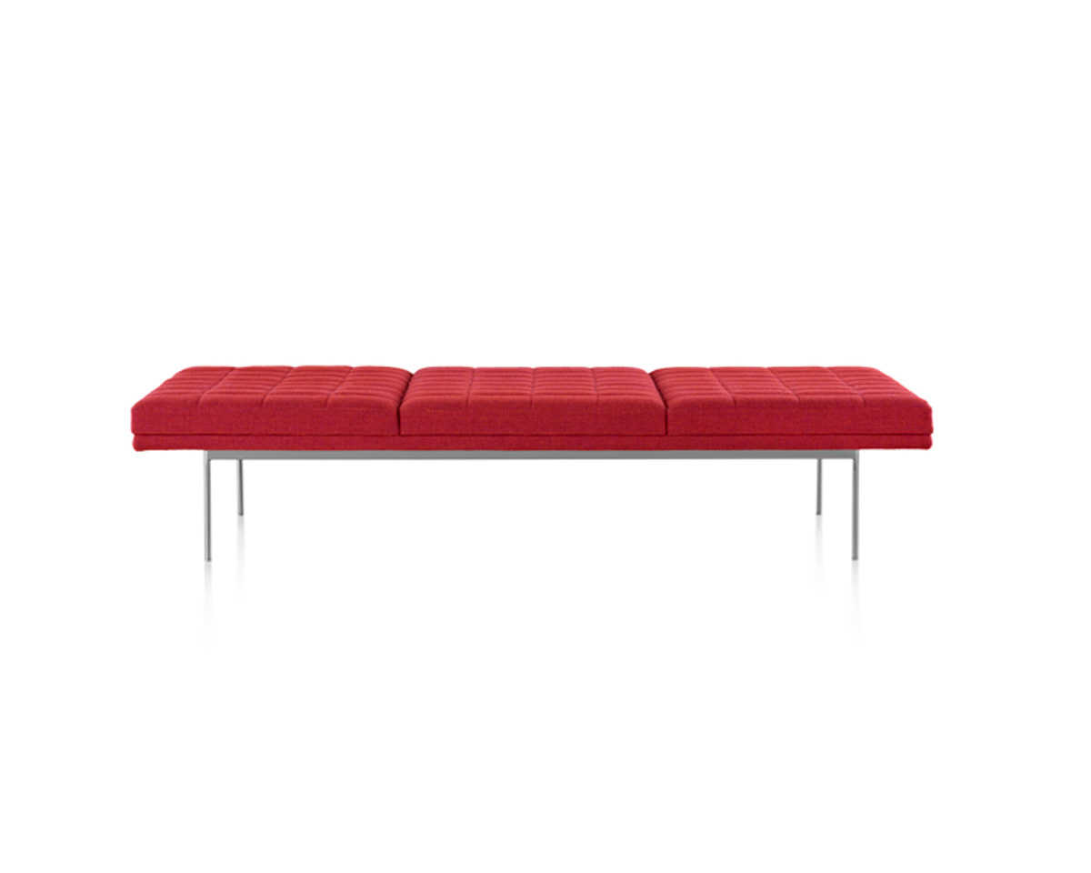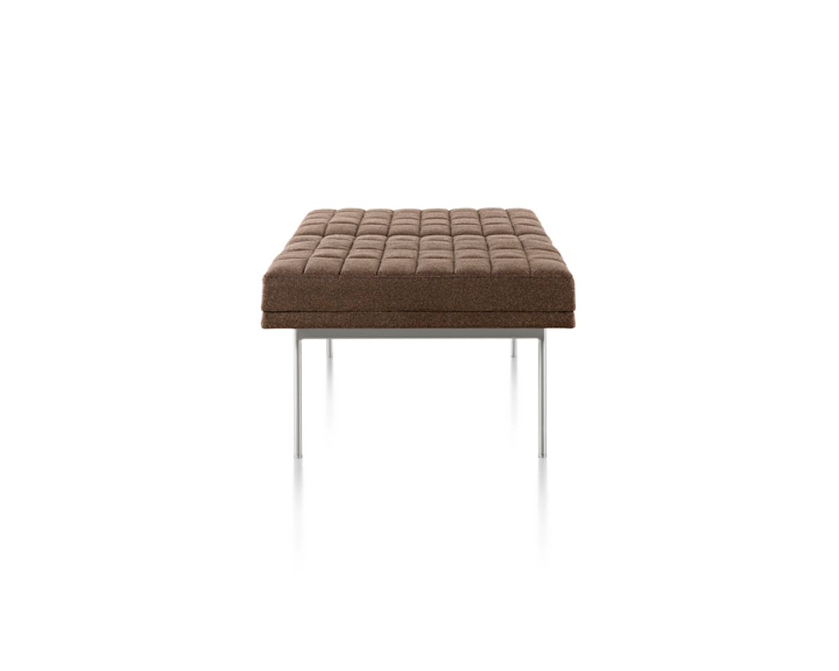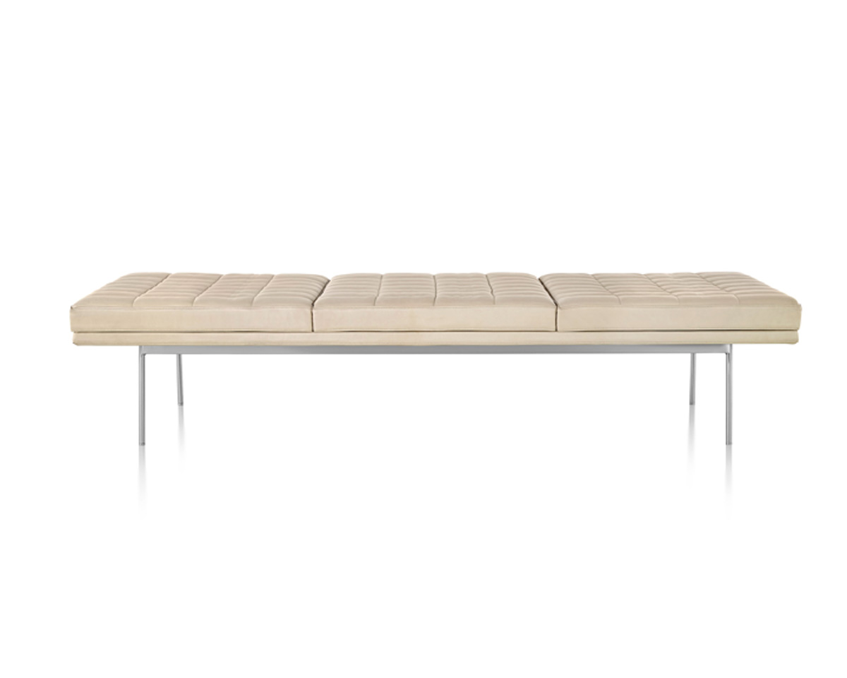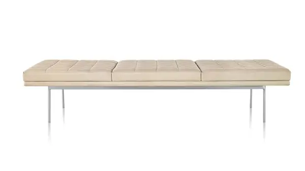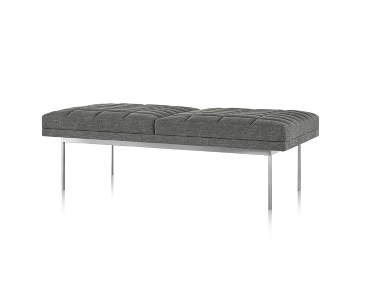 Cantilevered atop narrow steel legs that are available in a range of six metal finishes, Tuxedo Benches cut a low and sleek profile thanks to the crisply tailored upholstery that covers the slim, dual-density foam cushions. Each piece is available in a full range of upholstery with or without quilting.