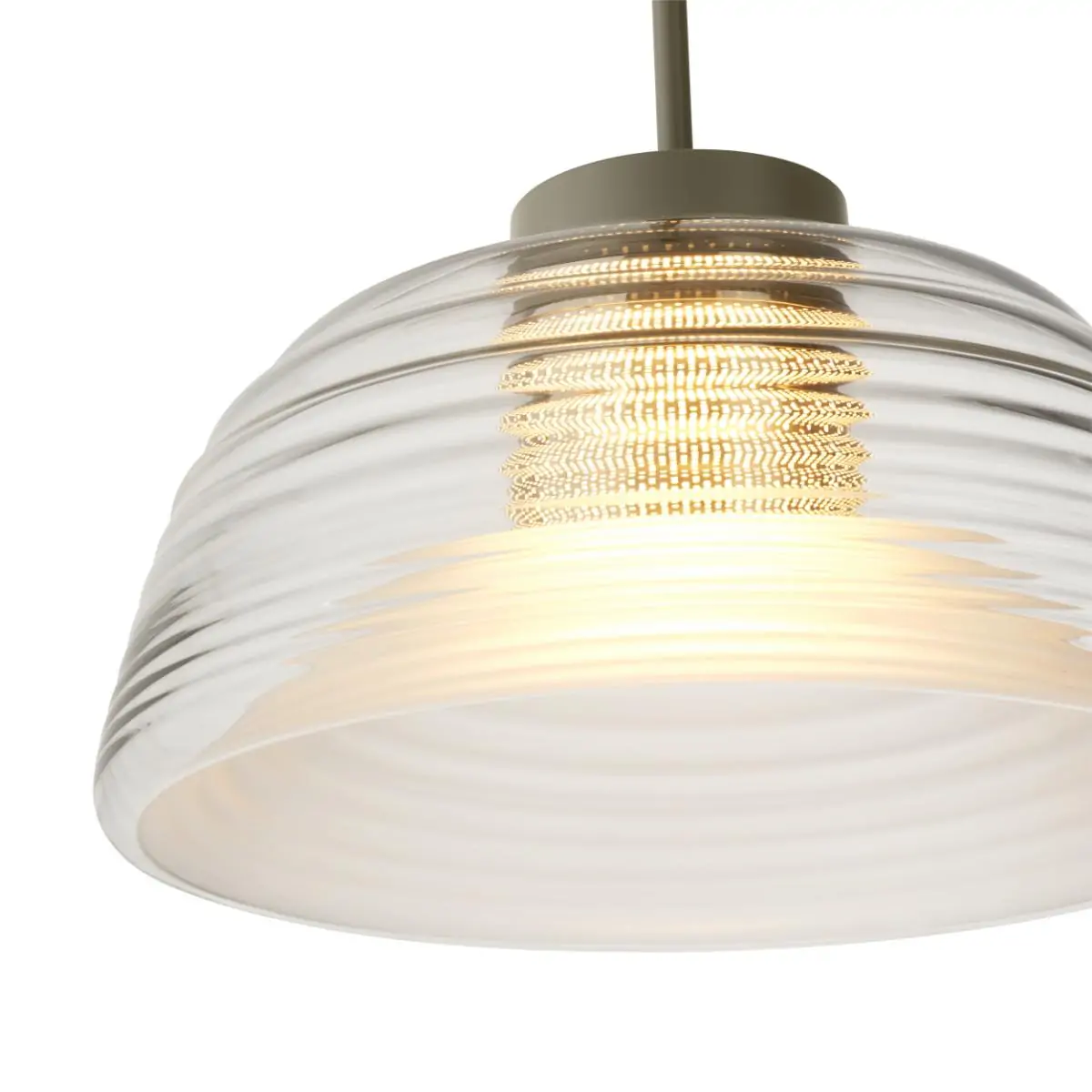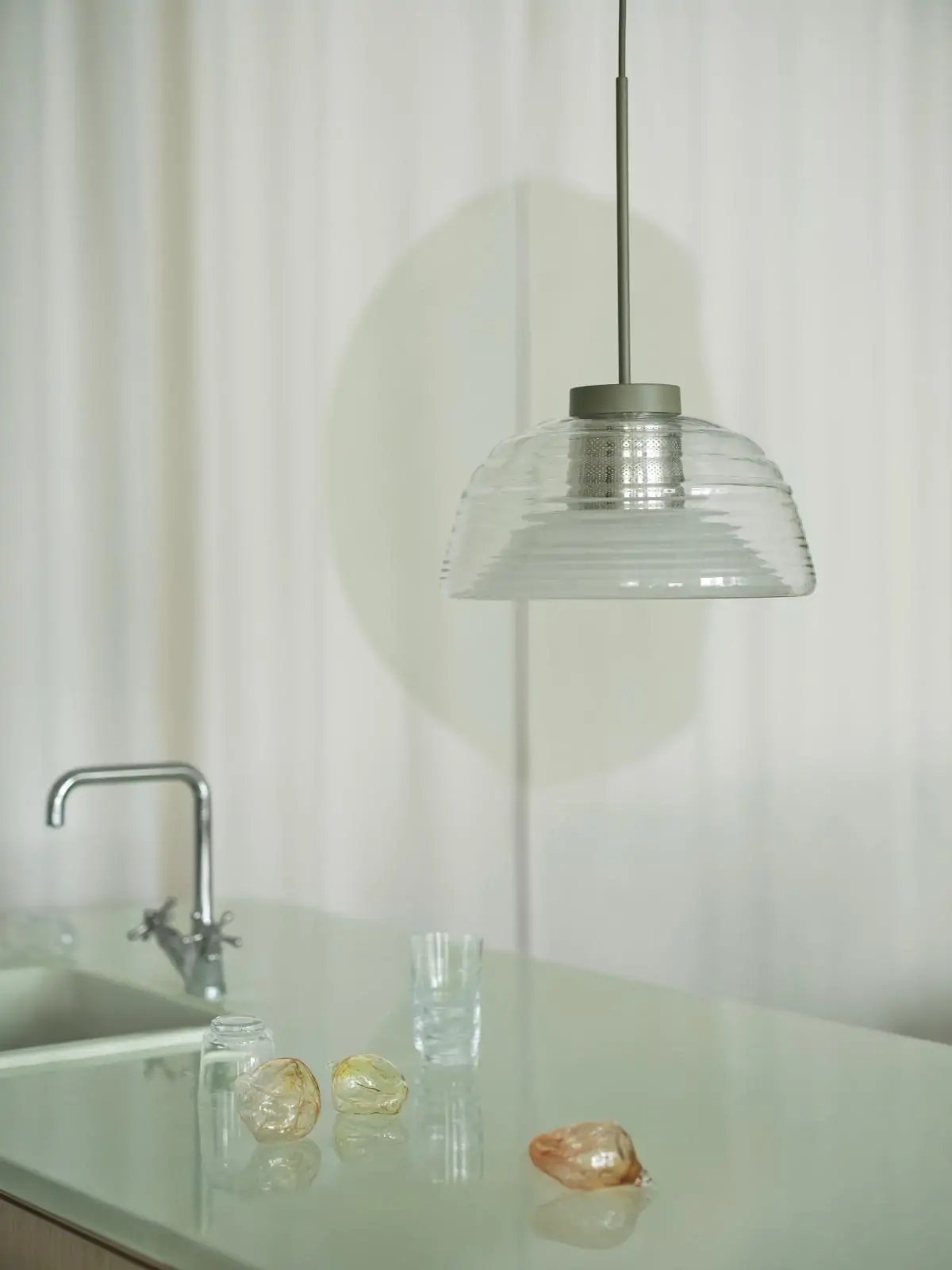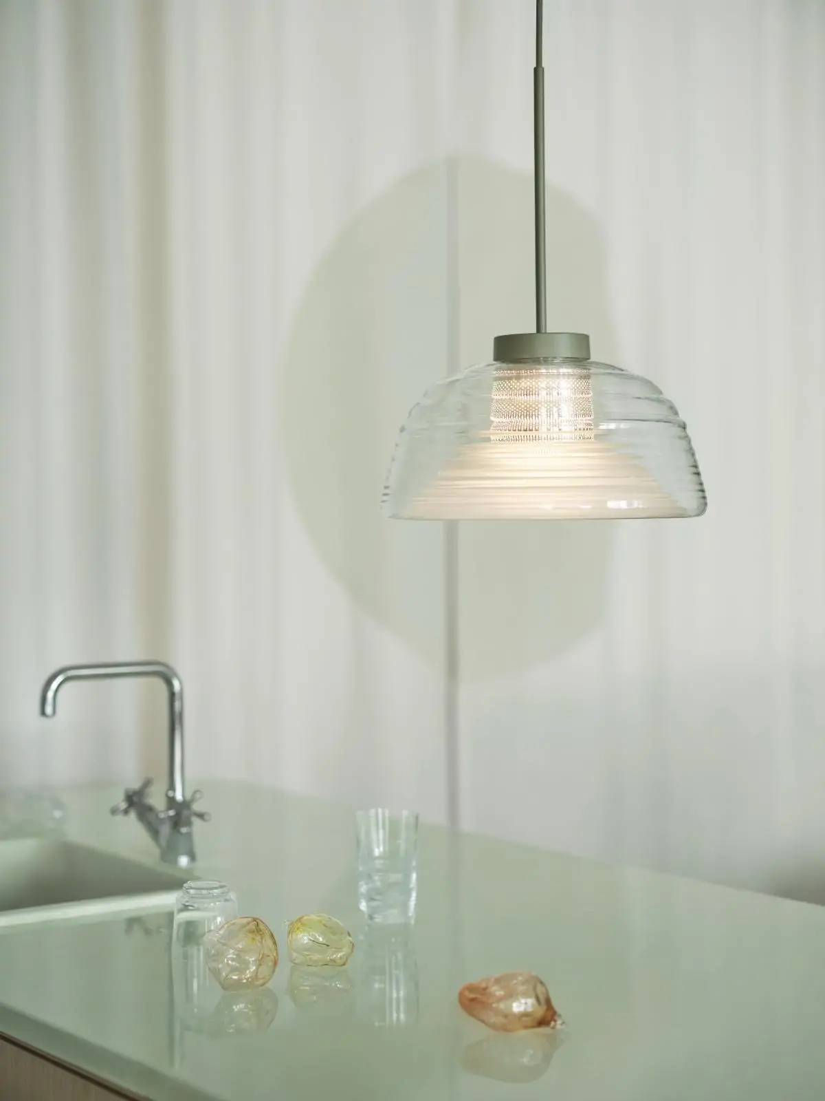 Bringing new perspectives on the classic glass pendant. Its rippled, mouth-blown glass creates unique optical effects that change depending on the angle you view it.