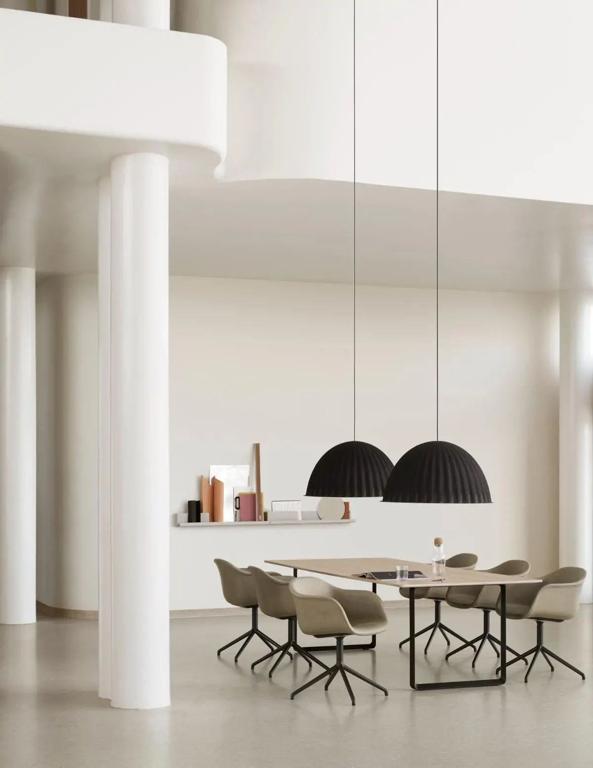 Designed in a material that uses 49% fibers made from recycled plastic, the Under The Bell Pendant Lamp not only brings a tactile and modern expression to any space but also impacts the acoustics of a room through its soft shade, paired with its graphic lines and subtle color palette.