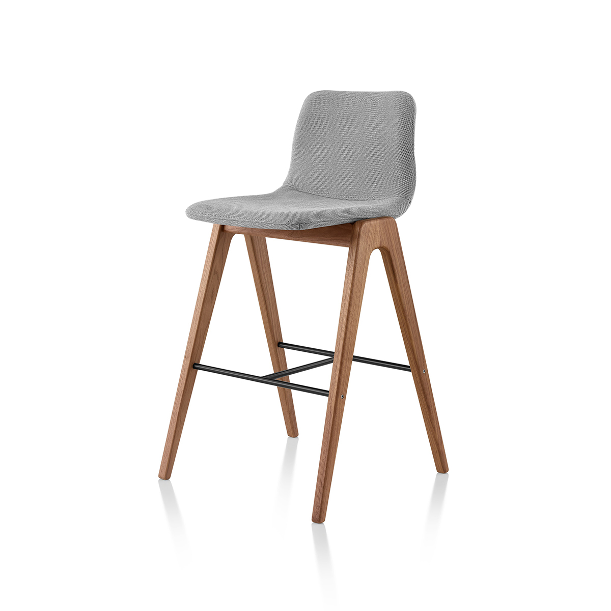 Perched atop long, tapered hardwood legs, the bucketed seat of the Viv Wood Stool cuts an elegantly slender profile. To achieve its neatly tailored look, the seat shell uses 3D-formed plywood layered with dense foam, then skilfully upholstered. Available in two heights, the base is hand-assembled from solid wood and sealed with matte lacquer.