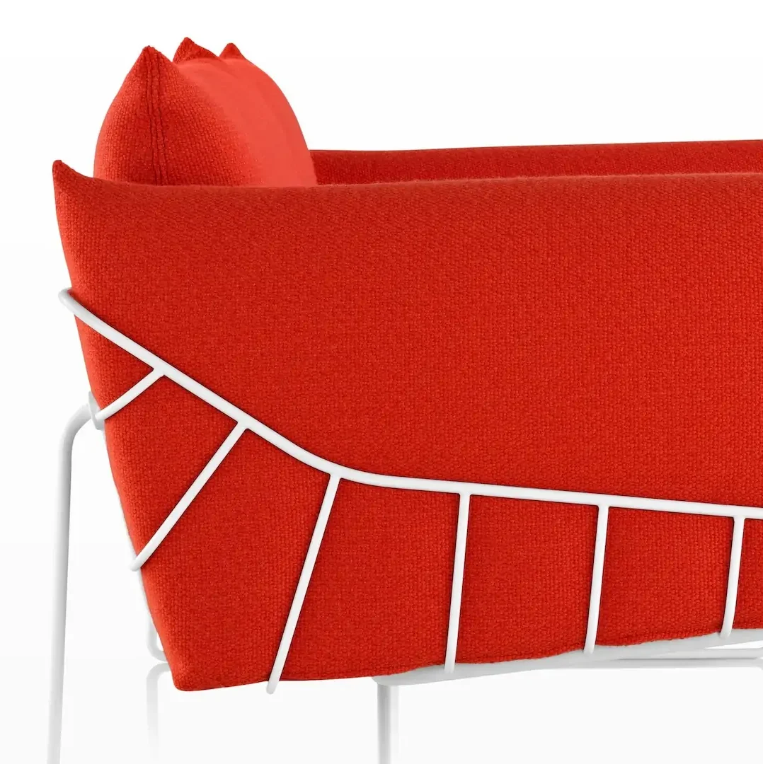 Visually speaking of softness and volume contained within a formal frame, the Wireframe Sofa Group exemplifies a recurring theme for Sam Hecht and Kim Colin: contrasting tension. The design’s external structure is shaped from steel wire—a material long used in classic Herman Miller designs for its strength and durability. Held within the frame are contoured cushions, which find added comfort from a suspension technology first developed by Herman Miller for the healthcare industry.